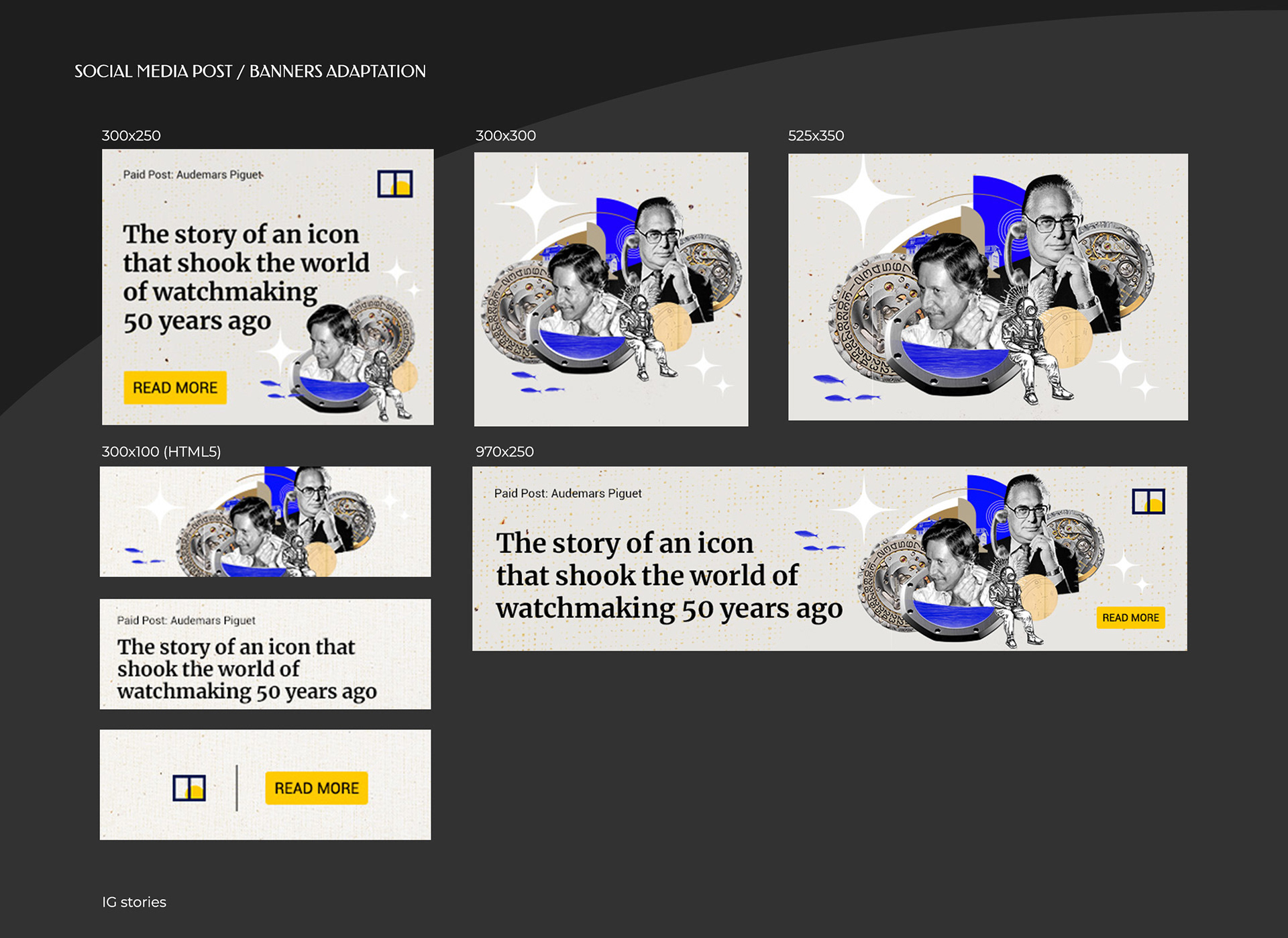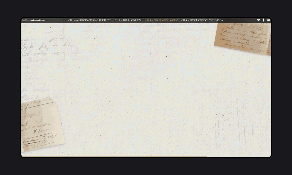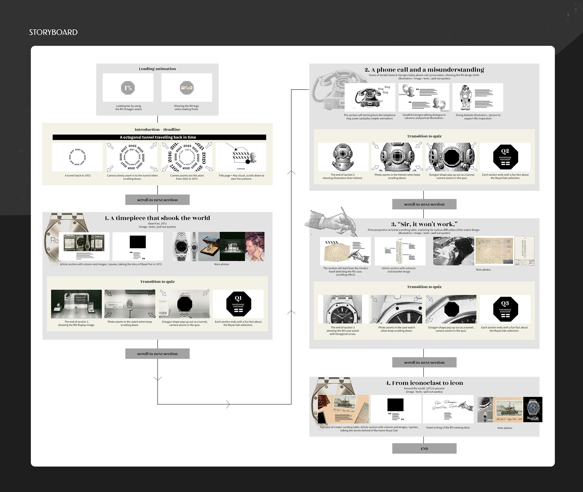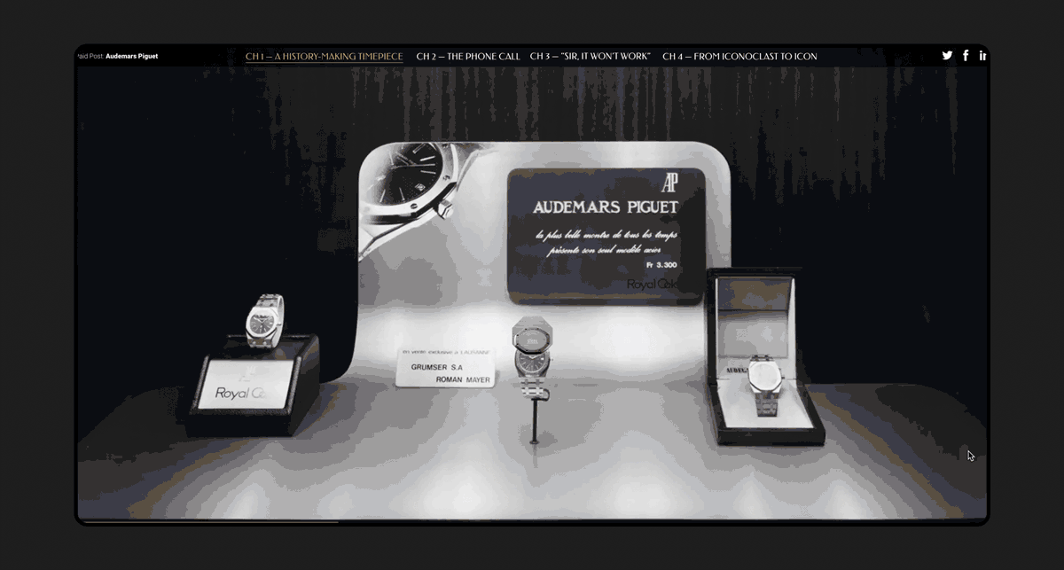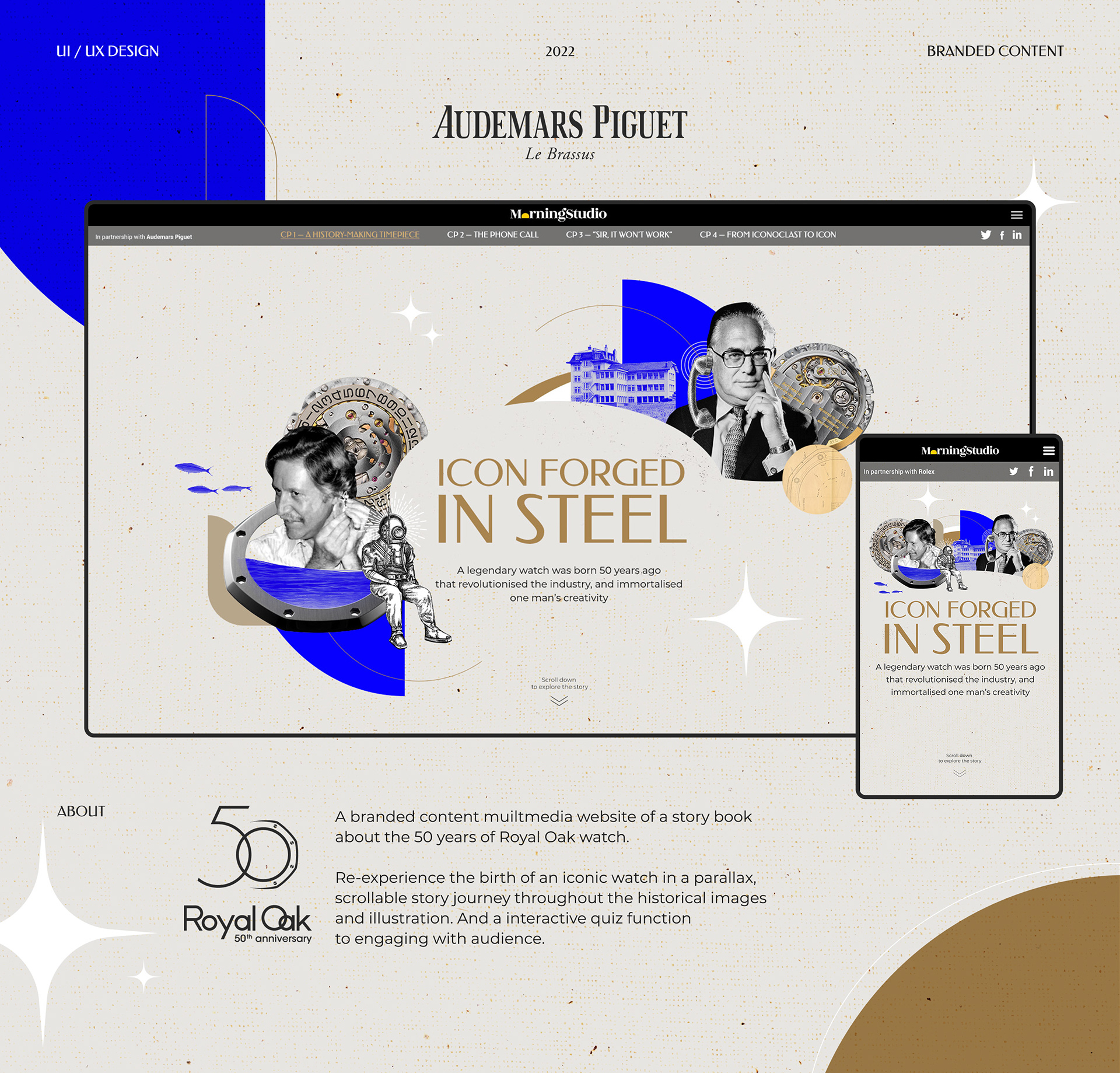 To celebrate Audemars Piguet’s iconic Royal Oak watch 50th anniversary, Morning Studio created a multimedia website to storytelling the legendary of the iconic watch. The website bringing readers into a parallax, scrollable four chapters story book journey, throughout the historical images and creative illustration. Also with quiz games, and animations function to engaging with audience.